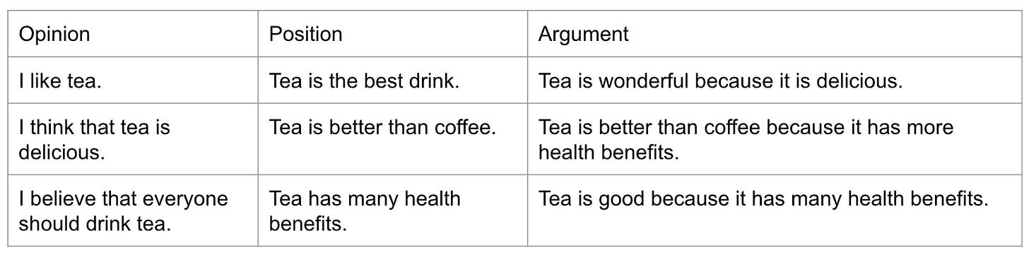 There are distinct but not necessarily independent formulations of opinions and positions. Distinguishing between them will make thinking and communicating more conscious, deliberate, and effective.